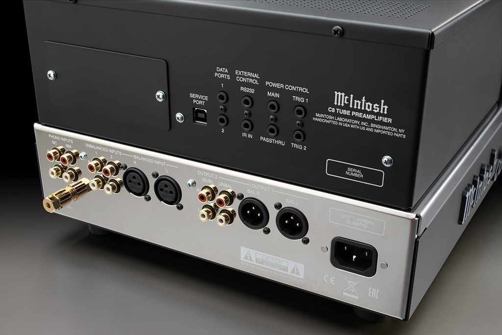 C8 được trang bị 1 ngõ vào balanced, 2 ngõ vào unbalanced analog, 1 ngõ phono MM và 1 ngõ phono MC (với khả năng hiệu chỉnh thông số cho phép phối ghép cùng các mẫu đầu kim đa dạng). Khi nâng cấp mạch DA2, C8 còn được tích hợp thêm 7 ngõ vào chuyên dụng, bao gồm: 2 coax, 2 optical, 1 USB, 1 MCT, và 1 HDMI ARC. Ấn tượng hơn, McIntosh còn trang bị cho C8 ngõ ra “McIntosh High Drive” headphone amplifier, cho phép người chơi trải nghiệm chất âm đặc trưng của McIntosh qua chiếc tai nghe yêu thích, mang lại sự riêng tư cho người dùng.