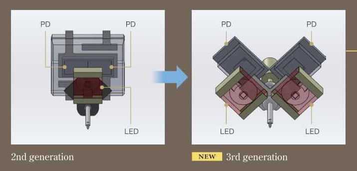 Kim đầu bảng DS Grand Master (phải) sử dụng bộ quang LED képViệc tách thành hai tổ hợp quang học như vậy giúp tăng gain đầu ra của kim từ 40mV lên đến 70mV. Và quan trọng hơn là cải thiện đáng kể tỉ số nhiễu S/N, tương ứng với nhiễu nền được hạ đến mức thấp đáng nể.