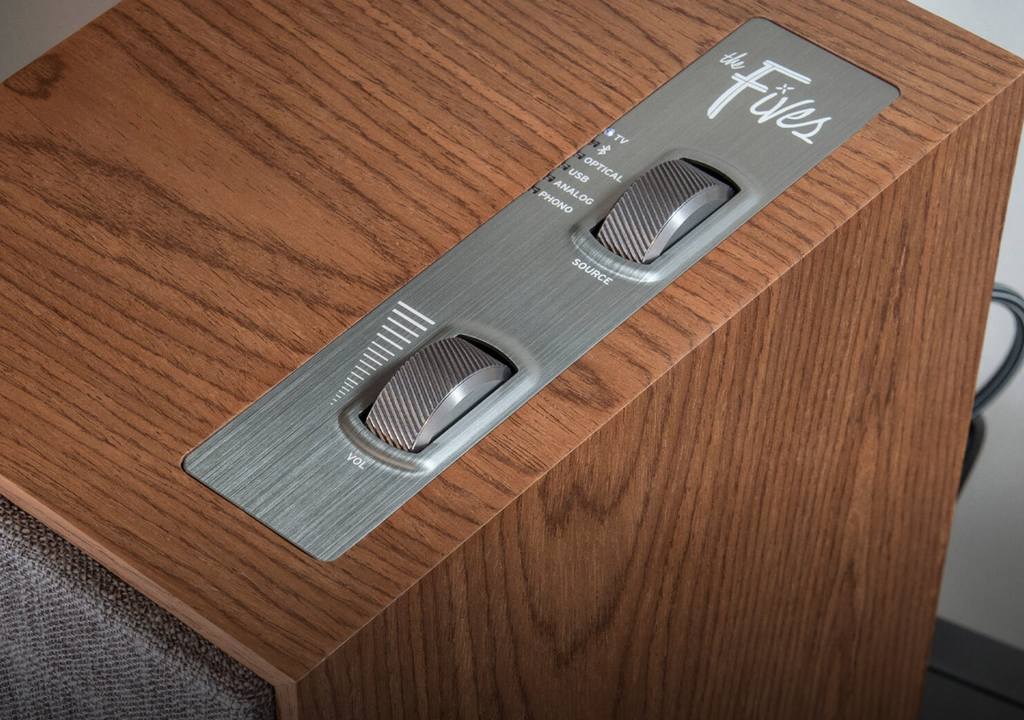 The Fives sở hữu nét thiết kế cổ điển sang trọng đặc trưng của Klipsch kết hợp thùng loa veneer gỗ tự nhiên và mặt lưới vải phong cách hoài cổ. Với kích thước khá nhỏ gọn, chiều sâu chỉ hơn 200mm, The Fives hoàn toàn phù hợp việc bố trí trên kệ sách, kệ tivi, phù hợp với những không gian nhỏ. Một điểm độc đáo trong thiết kế của The Fives chính là nút điều chỉnh âm lượng và chọn nguồn phát. Bộ nút điều khiển này được gia công bằng kim loại nguyên khối, dạng bánh xe xoay cuộn rất đặc biệt, tiếp xúc chắc tay và cảm giác “analog” hơn so với các phím cảm ứng.