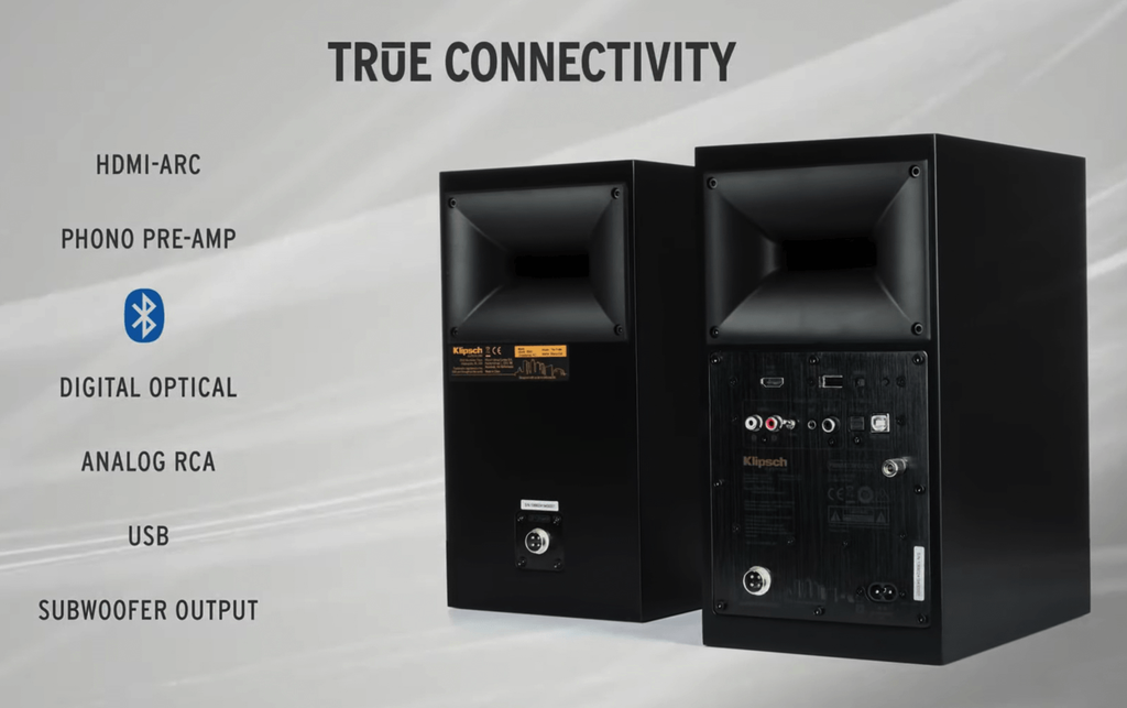 Klipsch The Fives hỗ trợ đa kết nối bao gồm giao thức không dây bluetooth, USB input tối đa 192kHz/24Bit, cổng optical, ngõ vào analog aux-in và đặc biệt là trang bị đường HDMI ARC cho phép kết nối đồng bộ với TV. Klipsch The Fives tái tạo hiệu ứng stereo hoàn hảo với không gian rộng và chiều sâu tốt hơn hẳn so với các dòng loa soundbar. Ngoài ra, The Fives cũng sở hữu ngõ vào phono MM cho phép người dùng kết nối trực tiếp với mâm đĩa than, vốn là một xu hướng đang phát triển rất mạnh trong những năm gần đây.