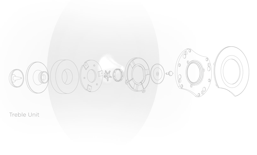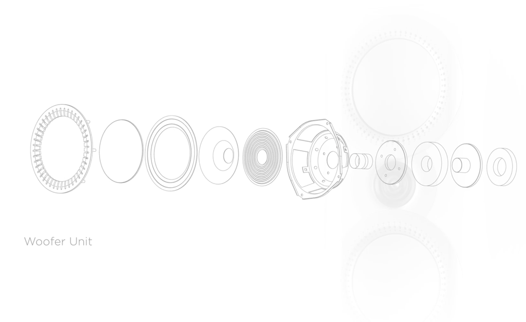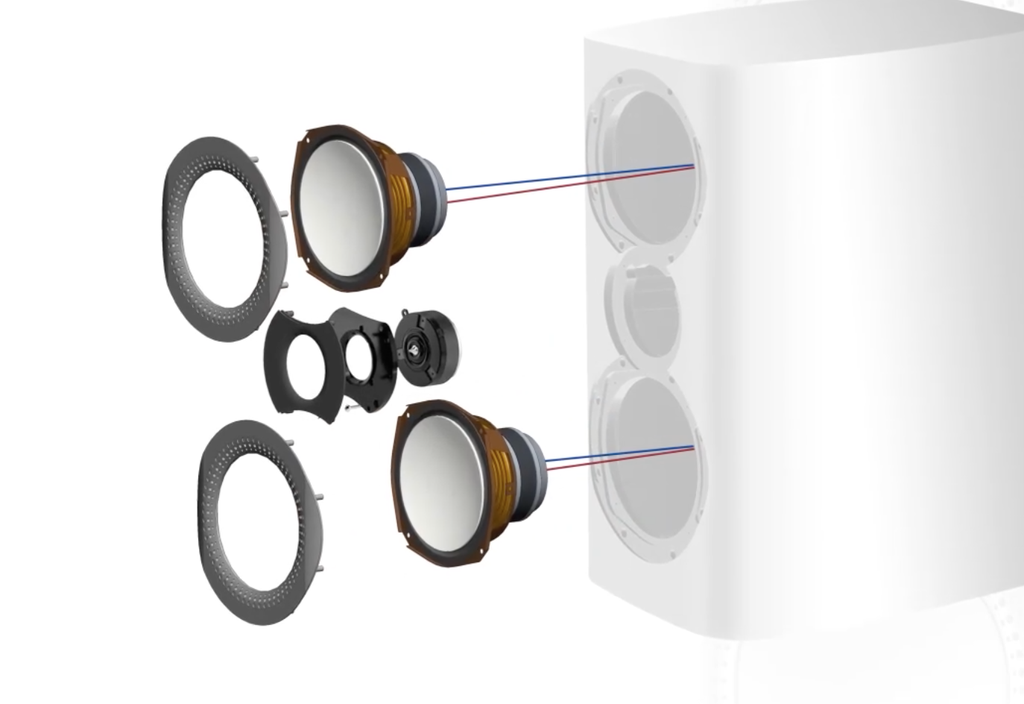 Các chi tiết cấu tạo nên tweeter Ring DomePhía trên và dưới loa tweeter là hai driver trung trầm màng nhôm được phủ lớp sơn trắng ở bề mặt. Mission gọi thiết kế của củ loa trung trầm này là “DiaDrive” thế hệ mới. DiaDrive là công nghệ woofer nổi tiếng của Misson sử dụng 2 màng diaphragm, màng loa thứ nhất sẽ gắn với viền và bắt vào thùng loa, màng thứ hai gắn voice-coil, tương tác chính với hệ thống từ, là nơi phát động lực di chuyển.