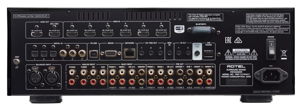 Pre surround mới của Rotel có 7 ngõ vào và 2 ngõ ra HDMI hỗ trợ chuẩn hình 4K HDR. Riêng các cổng kết nối tín hiệu audio gồm có đầu vào XLR dành cho thiết bị stereo, cổng PC- USB(24bit/ 192kHz), 3 cổng optical, 3 cổng coaxial, 3 cổng RCA, iPod USB, kết nối không dây bluetooth chuẩn apt-X và cụm ngõ in/out 7.1 kênh. Ngoài ra, Rotel RSP-1576 MKII cũng được trang bị 1 ngõ vào phono MM để kết nối với mâm thanh (dùng kim cartridge MM).