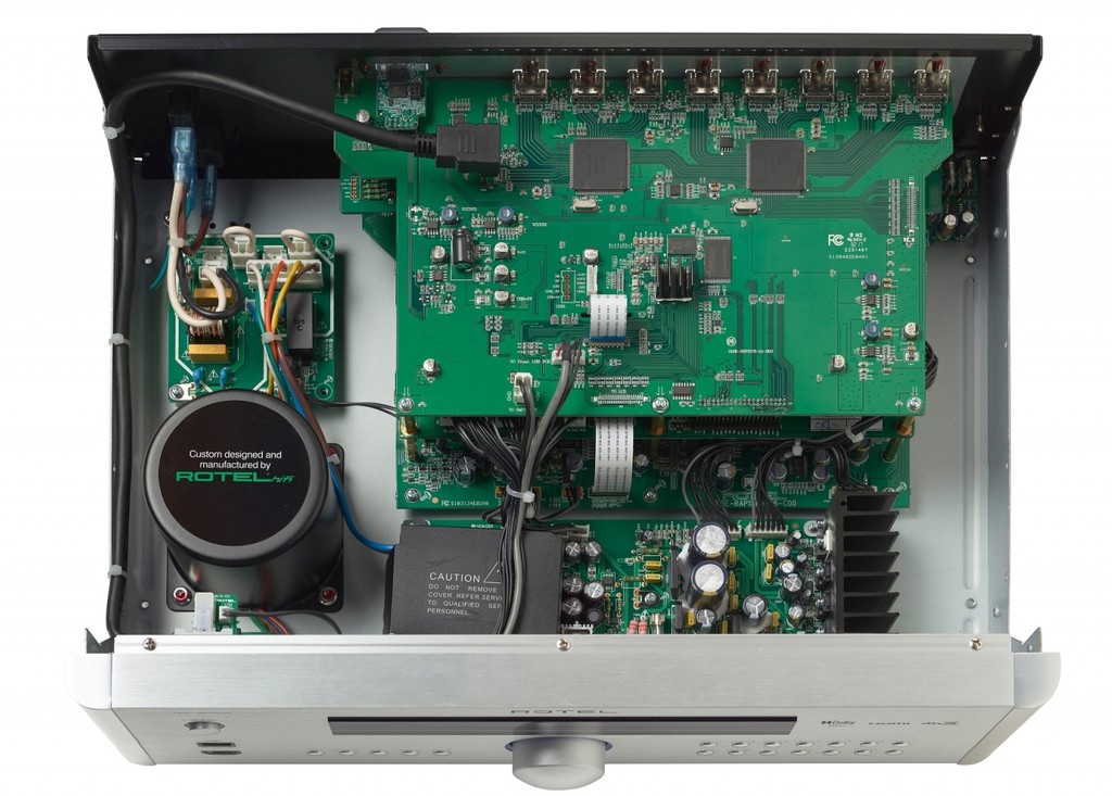 Bên trong Rotel RAP-1580 MK II nổi bật với biến thế xuyến và hệ thống tụ điện lớn chiếm gần một nửa diện tích máy. Receiver này có 7 ngõ vào HDMI (gồm 6 cổng ở mặt sau và 1 ở mặt trước), trong đó có 3 ngõ hỗ trợ HDMI 4K HDR và cả hai đầu ra hỗ trợ HDMI 4K HDR. Tương tự như pre surround RSP-1570 MK II, receiver RAP-1580 MK II cũng có đầy đủ các kết nối digital, USB, bluetooth và cả ngõ vào phono MM.